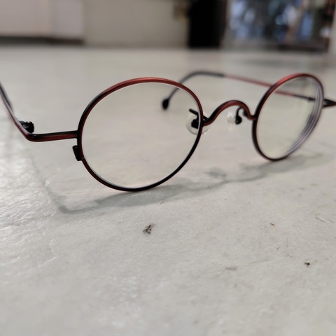 アンティーク感あるアイワークスのフレームでメガネをお作り頂きました。 小さめサイズの丸メガネで、赤と黒のカラーリングがとてもオシャレです。 前···